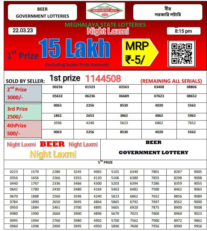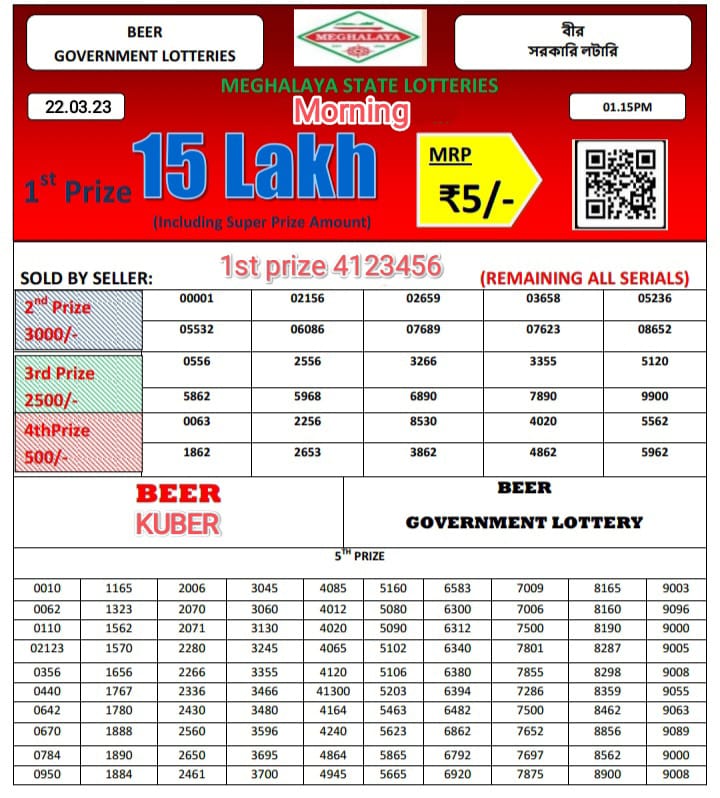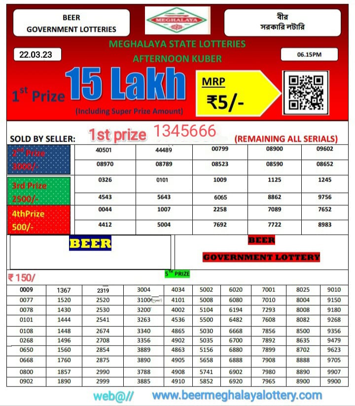 Welcome to Beer Meghalaya State Lottery updated for Meghalaya State lottery on regular basis so visit site and get updated. This beer lottery weekly game based on number. Live from online steering formula so choose wisely and play well. Our game contains 2 live match within 7 hours interval of time which starts at 1:30 pm, 8:30 pm and Sunday WEEKLY DHAMAKA Lottery result will be published every Sunday in 09.30 p.m.check below for results. Thank You.
